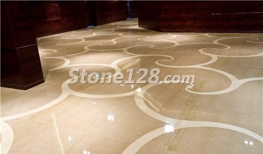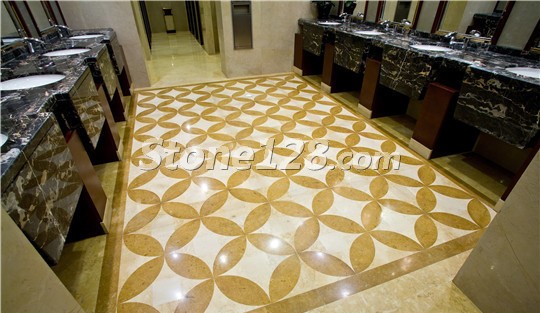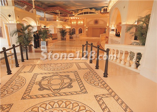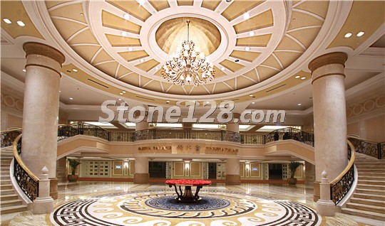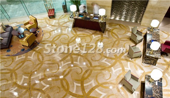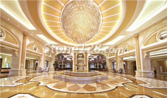 多种大理石材料搭配而成的无缝水刀拼花是该酒店的一大亮点,主要应用的石材品种为:帝皇金、布朗金、意大利黑金花、金世纪米黄。