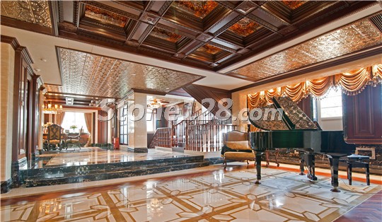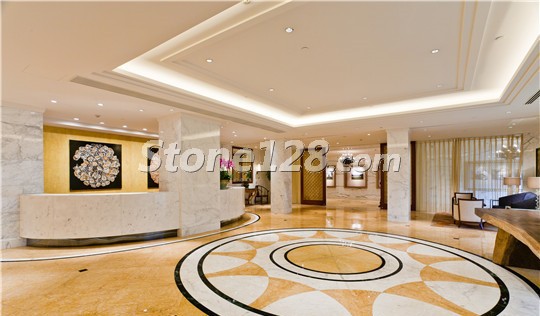 石材地面的无缝拼花图案很有特色,整个空间运用的石材品种为:意大利黑金花、罗马洞、世纪米黄、帝皇金、罗马米黄、伯利黄。