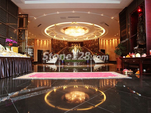 地面主要用材是橙色系大理石春天玫瑰,石材拼花巧妙地运用白色系的鱼肚白和黑色系的黑金花共同拼出几个同心圆,使整个空间色泽明快、金碧辉煌。该酒店工程由环球石材承接,并荣获2011第三届中国长三角优秀石材建设工程金石奖建筑内装饰奖。