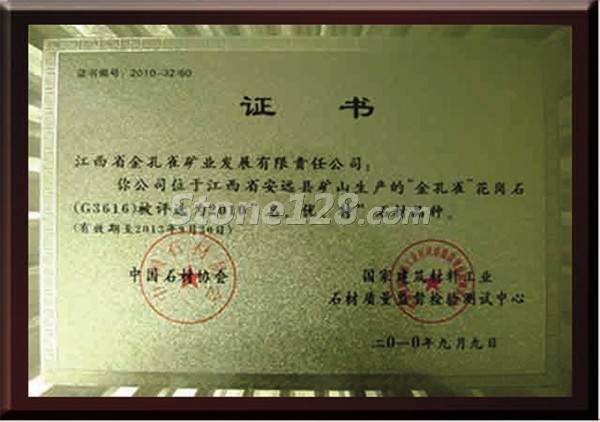 中国石材协会,国家石材质量监督中心评选为2010全国“名、优、特”石材品种。