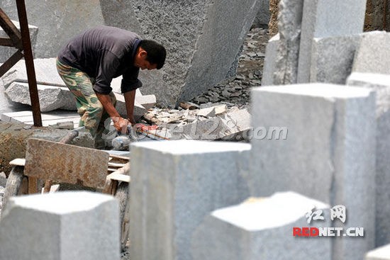 长沙望城区丁字镇金云村村民陈罗生从事花岗岩加工已经近10个年头。从2012年3月起,他所在的麻石加工小作坊只剩下他自己一个人在切割石材。他指着作坊对面的山说:“上面下来的石料越来越少了,政府现在不让采,所以这里只要我一个人做事就够了。”
