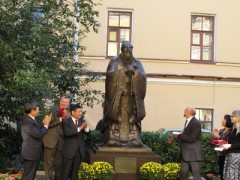 图中显示的是我们为上海世博会精心雕刻的仿金孔子行教标准像。另外我们为清华大学精心雕刻的孔子行教像,现在安放在清华园荷塘畔。  一个好的老师,能让他的学生变化气质。而有一个人,有一本书,能让一个民族变化气质,这个人就是孔子,这本书就是《论语》,这个民族就是中华民族,这种气质就是“文质彬彬”的君子气质。